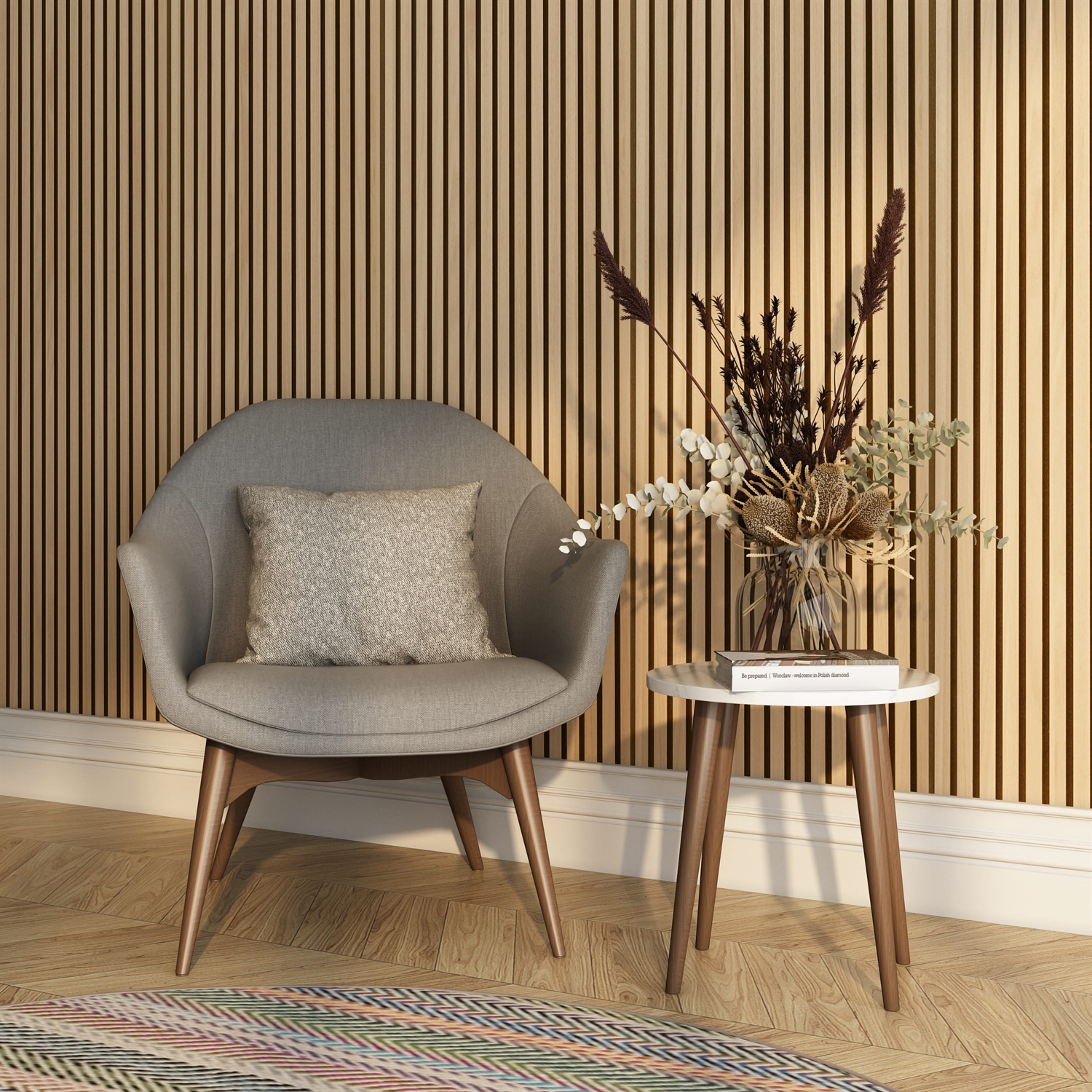 Questi pannelli fonoassorbenti sono prodotti con una base assorbente di poliestere di 9 mm, prodotta parzialmente da bottiglie di plastica riutilizzate. Sulla parte superiore del panno in feltro fonoassorbente da 9 mm, sono fissate delle doghe in MDF. Questi pannelli fonoassorbenti in frassino, quercia affumicata o noce americana, sono disponibili in diversi tipi di oliatura, che permettono una grande creatività Le doghe sono di ca. 1,1 cm di profondità e 2,7 cm di larghezza con una distanza di 1,3 cm tra ogni doga.